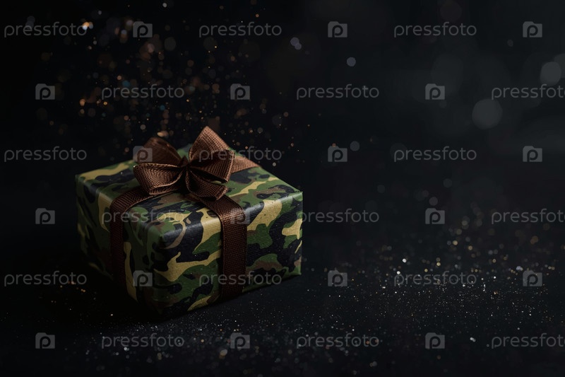Подарочная коробка камуфляжного цвета с праздничной атласной ленточкой на темном фоне.Концепция празднования Дня защитника Отечества 23 февраля