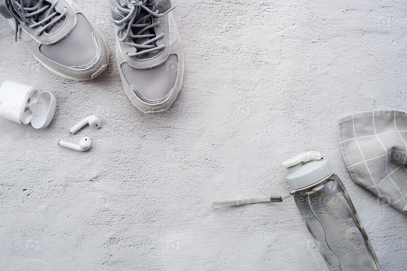 Здоровый образ жизни и фитнес в спорте, утреннее бегство. кроссовки, смарт-трекер для фитнеса, беспроводные наушники и бутылка с водой на сером фоне. вид сверху и плоский слой