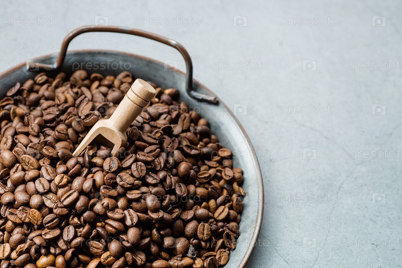 Меню кафе и ресторанов. Кофейные бобы и деревянная ложка на близком расстоянии. Копировать пространство для текста. Концепция горячих напитков