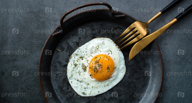 Домашнее жареное яйцо в старинной сковороде и стильные столовые приборы на темном фоне. Вид сверху. Копировать пробелы для текста