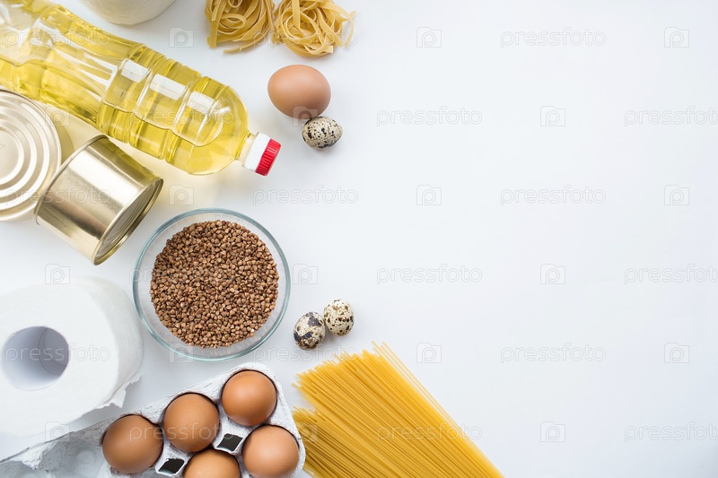 Продовольственные поставки кризисные запасы продовольствия на период карантинной изоляции Скан-продукты, макароны, яйца, гречка, туалетная бумага на белом фоне.Копировальное пространство для текста