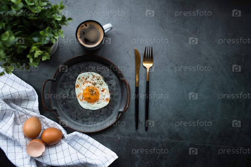 Домашнее жареное яйцо в старинной сковородке и стильные столовые приборы на темном фоне. Вид сверху. Копировать пространство для текста
