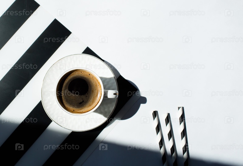 Меню кафе и ресторанов. кружка ароматического кофе на полосатом, черно-белом фоне. копирование пространства для текста. концепция горячих напитков