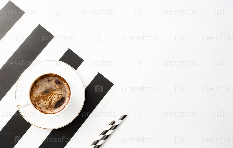 Меню кафе и ресторанов. кружка ароматического кофе на полосатом, черно-белом фоне. копирование пространства для текста. концепция горячих напитков