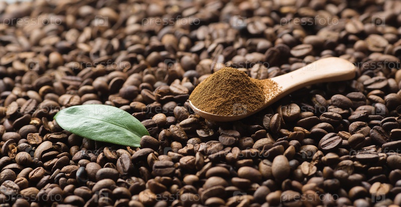Баннер. Меню кафе и ресторанов. Кофейные бобы и деревянная ложка с измельченным кофе в ближайшем плане. Копировать пространство для текста. Концепция горячих напитков и рекламы