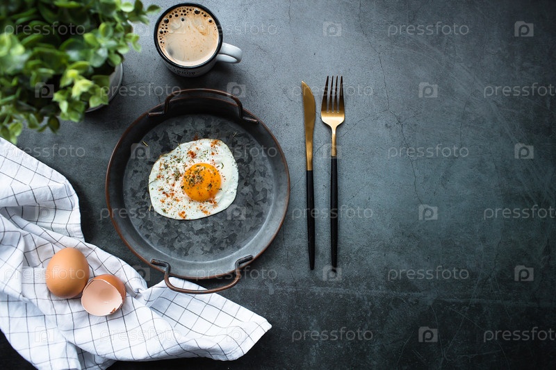 Домашнее жареное яйцо в старинной сковородке и стильные столовые приборы на темном фоне. Вид сверху. Копировать пространство для текста