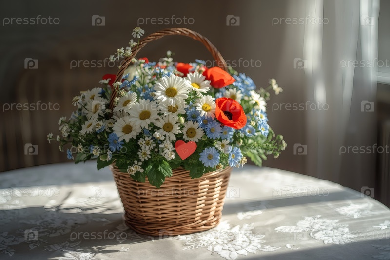 Концепция празднования Дня России - красивый, легкий и воздушный букет белых ромашек, красных маков и голубых кукурузных цветов в плетеновой корзине на ярком столе
