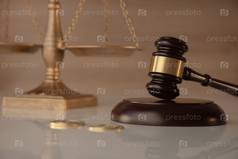 Молоток судьи, монеты и весы Правосудия