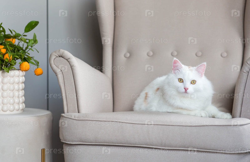 Молодой белый пушистый кот, сидящий на бежевом кресле в гостиной