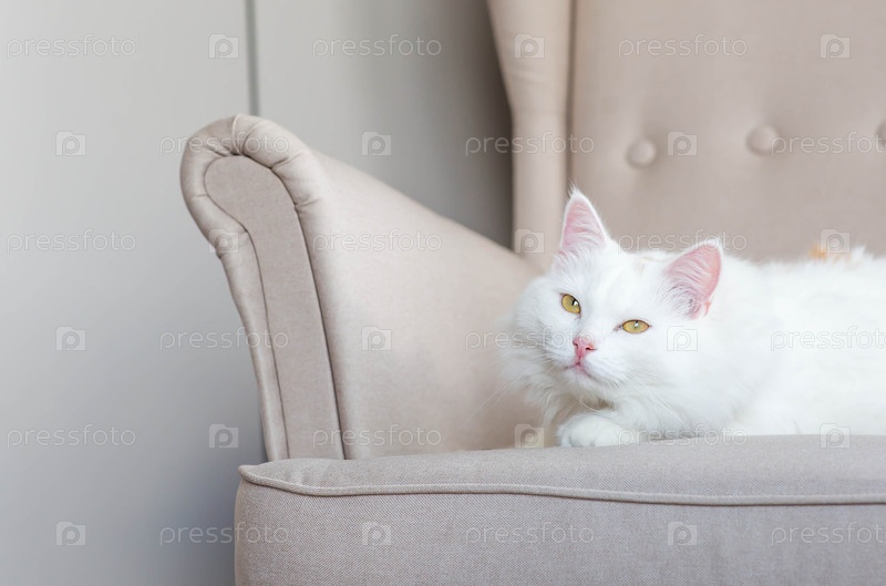 Молодой белый пушистый кот, сидящий на бежевом кресле в гостиной