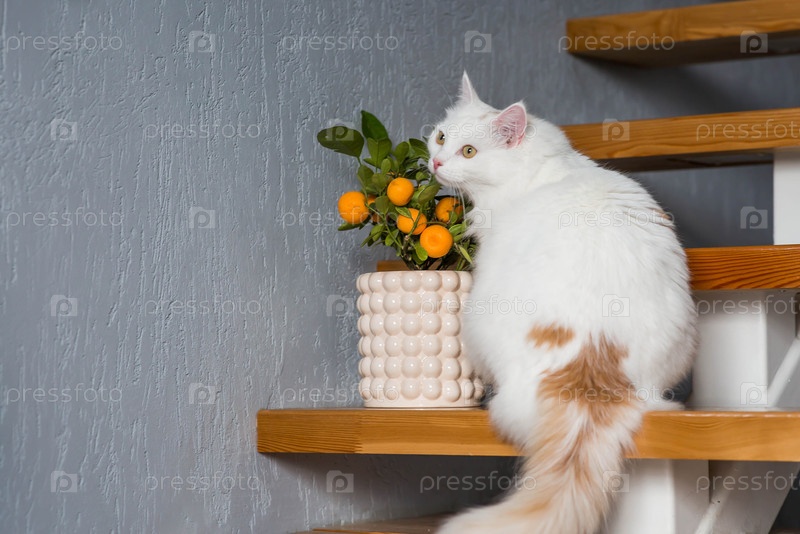 Маленький белый пушистый кот сидит на лестнице в доме