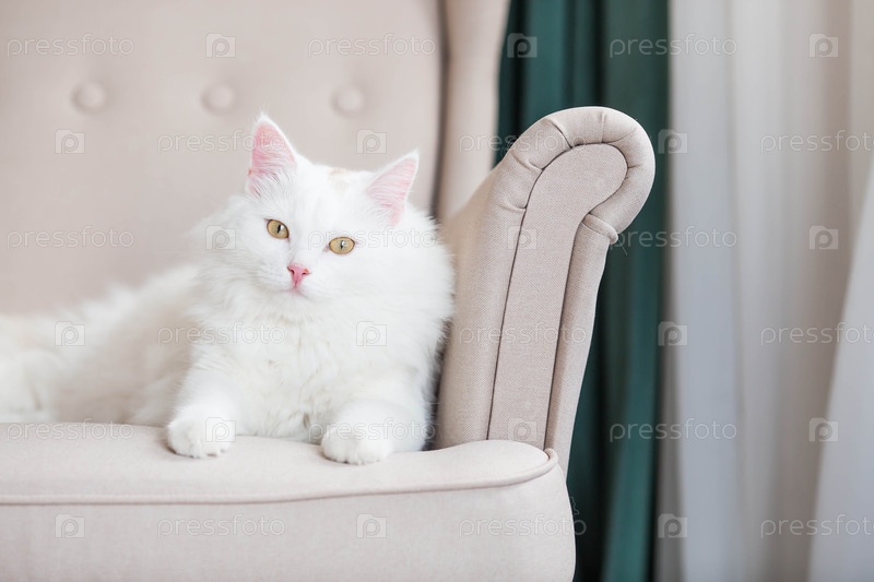 Молодой белый пушистый кот, сидящий на бежевом кресле в гостиной