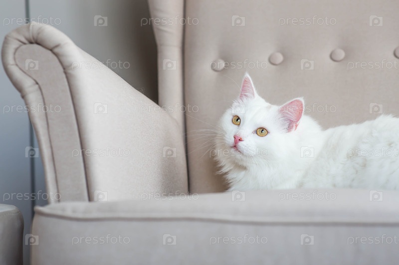 Молодой белый пушистый кот, сидящий на бежевом кресле в гостиной