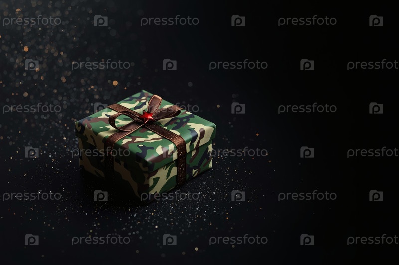 Подарочная коробка камуфляжного цвета с праздничной атласной ленточкой на темном фоне.Концепция празднования Дня защитника Отечества 23 февраля