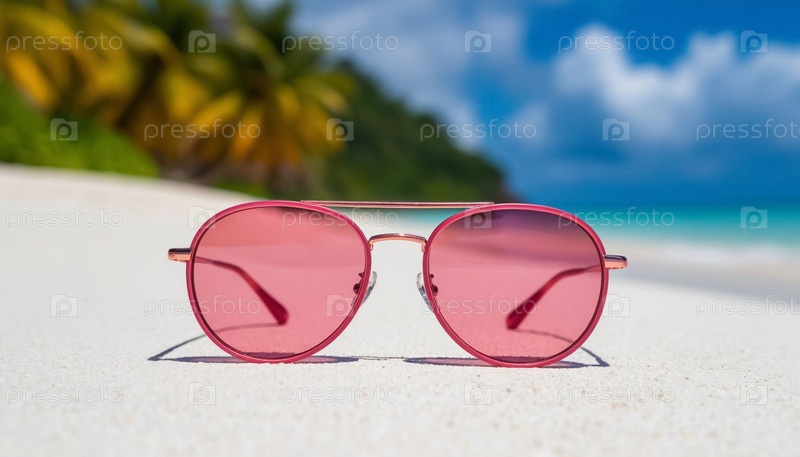 Розовые поляризованные солнцезащитные очки авиатора на белом песчаном морском пляже