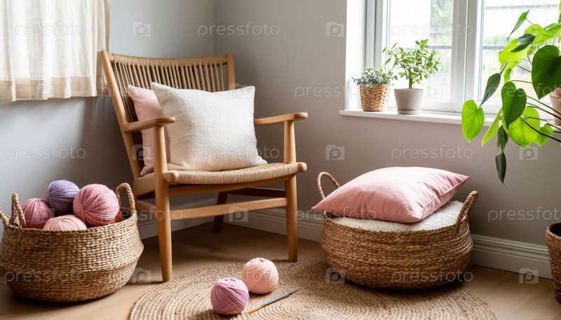 Уютный уголок ремесла в доме - стул и корзина с пряжей возле окна