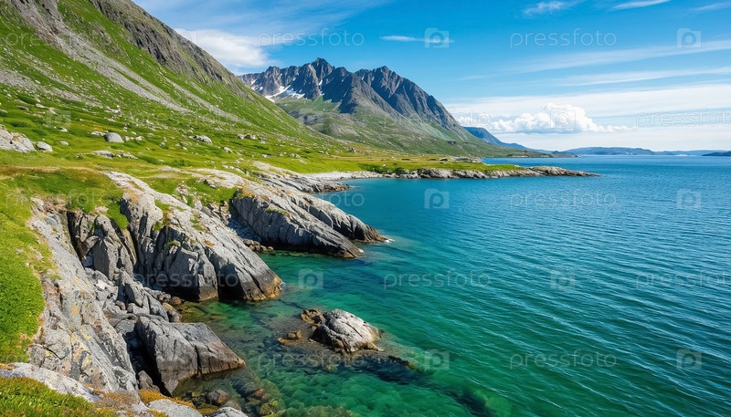 Океаническое побережье с высокими горами и зелеными холмами.Природа Исландии