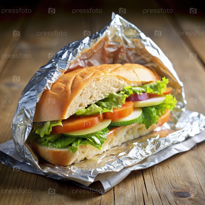 Свежеизготовленный вегетарианский бутерброд, завернутый в алюминиевую фольгу на деревянном столе