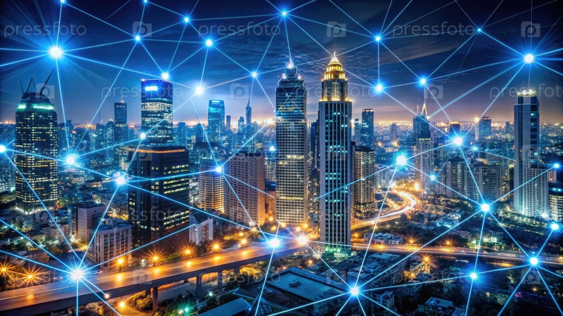 Cityscape Lights освещают подключенные небоскребы ночью. генеративный ИИ