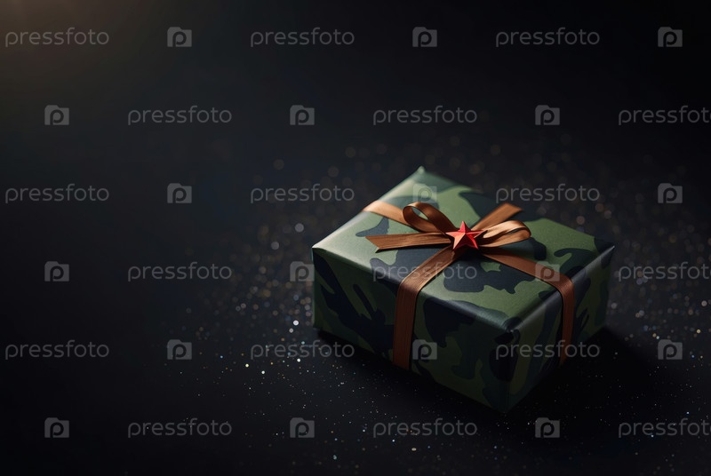Подарочная коробка камуфляжного цвета с праздничной атласной ленточкой на темном фоне.Концепция празднования Дня защитника Отечества 23 февраля