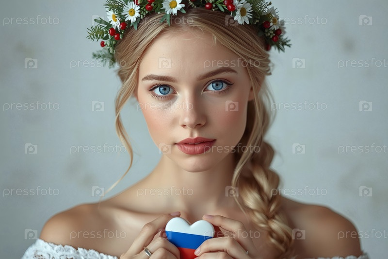 Всероссийский День семьи, любви и верности Красивая девушка с венком ромашек на голове и сердцем цвета русского флага Святой Валентин Петра и Февронии
