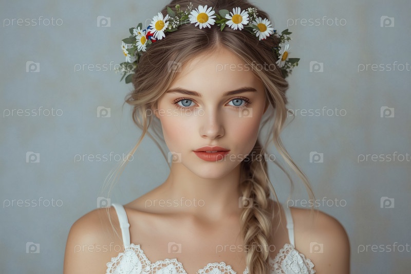 День России или День семьи, любви и верности.Портрет красивой девушки с венком ромашек на голове