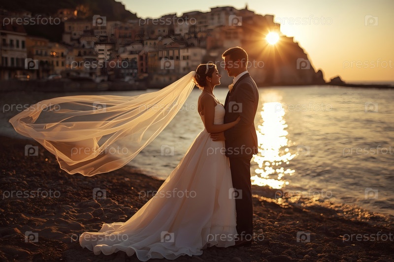 Свадебная пара обнимается у моря при закате солнца счастливые молодожены улыбаются невеста и жених создают семью