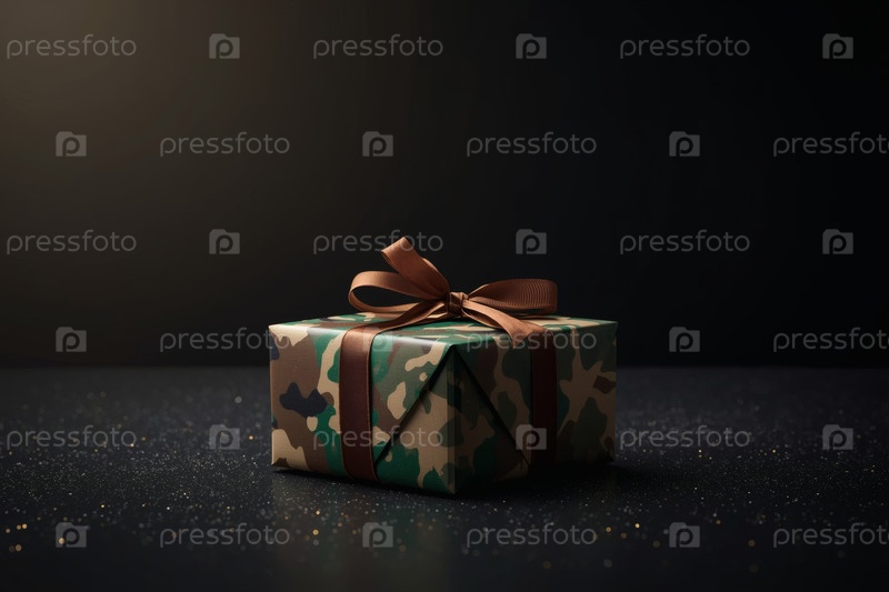 Подарочная коробка камуфляжного цвета с праздничной атласной ленточкой на темном фоне.Концепция празднования Дня защитника Отечества 23 февраля