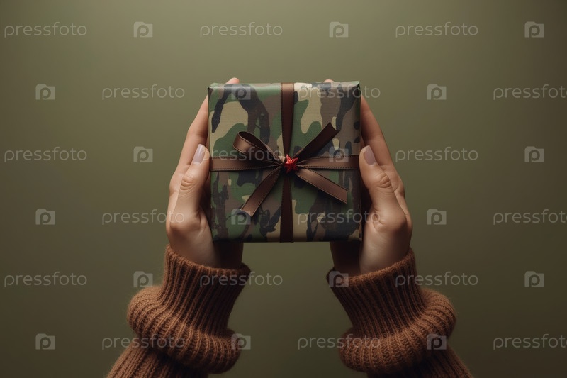 Близкий план женских рук, держащих подарок на День защитника Отечества в камуфляжной упаковке с атласной лукой. концепция праздника 23 февраля