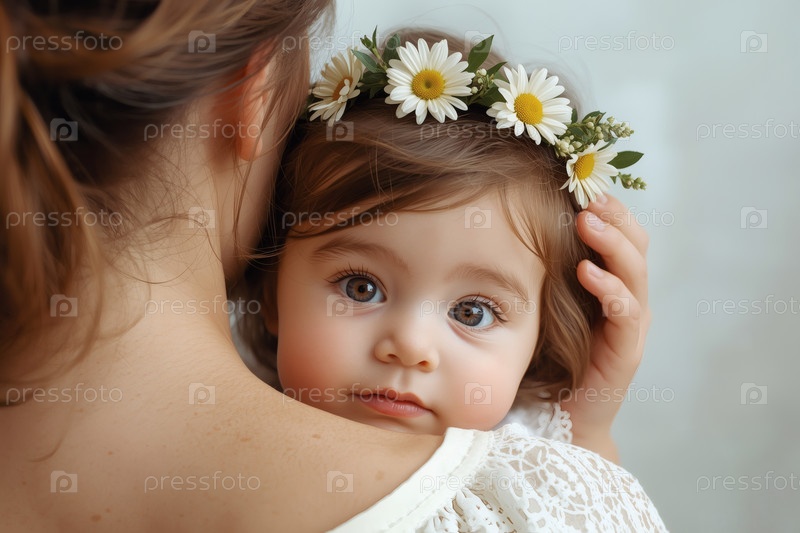 Концепция Дня семьи, любви и верности в России: маленькая девочка с венком ромашек на руках у матери