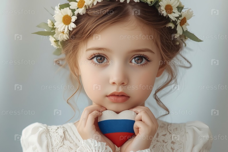 Всероссийский день семьи, любви и верности. красивая маленькая девочка с венком маргариток на голове и сердцем цвета российского флага. День святого Валентина Петра и Февронии