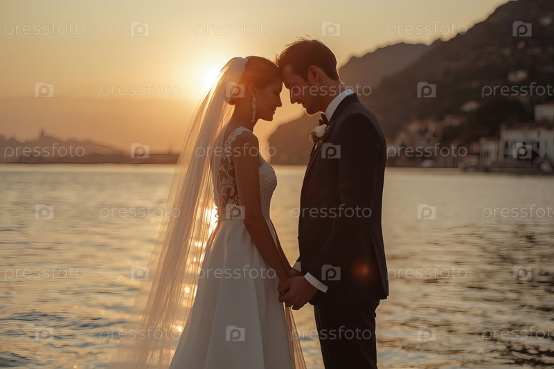 Свадебная пара обнимается у моря при закате солнца счастливые молодожены улыбаются невеста и жених создают семью