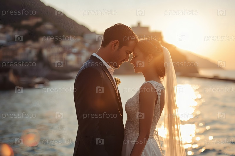 Свадебная пара обнимается у моря при закате солнца счастливые молодожены улыбаются невеста и жених создают семью