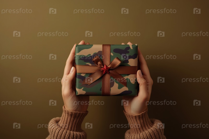 Близкий план женских рук, держащих подарок на День защитника Отечества в камуфляжной упаковке с атласной лукой. концепция праздника 23 февраля