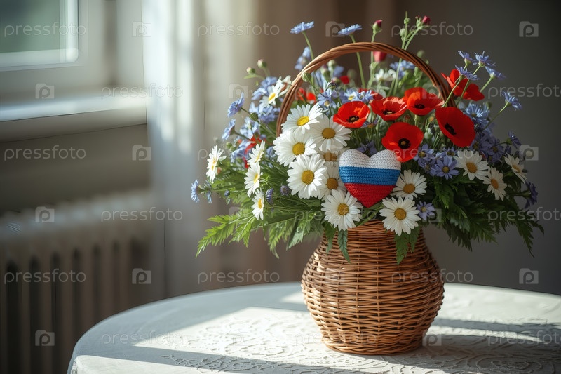 Концепция празднования Дня России - красивый, легкий и воздушный букет белых ромашек, красных маков и голубых кукурузных цветов в плетеновой корзине на ярком столе