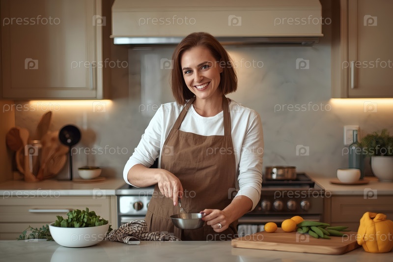 Красивая женщина средних лет готовит еду на современной кухне
