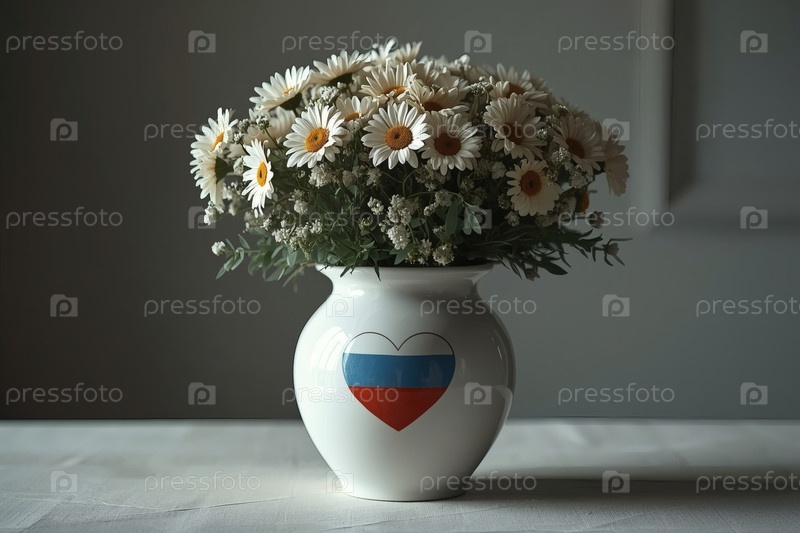 Концепция празднования Дня семьи, любви и верности в России.Красивый, легкий и воздушный букет маргариток в вазе на светлом фоне.Близкий план