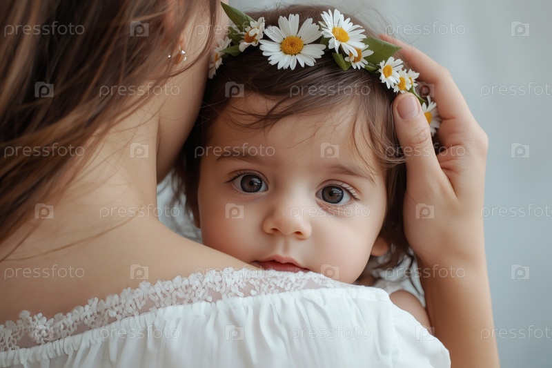 Концепция Дня семьи, любви и верности в России: маленькая девочка с венком ромашек на руках у матери