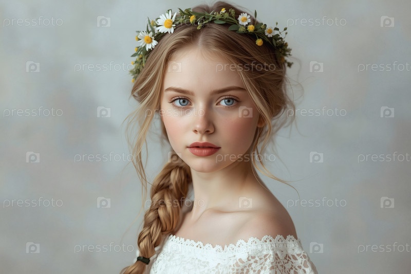 День России или День семьи, любви и верности.Портрет красивой девушки с венком ромашек на голове