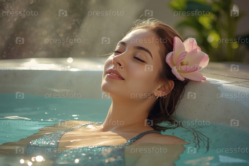 Молодая красивая женщина в бирюзовом бассейне Концепция здорового образа жизни, отдых, расслабление, туризм, косметические спа-процедуры на базе красоты, любовь к себе
