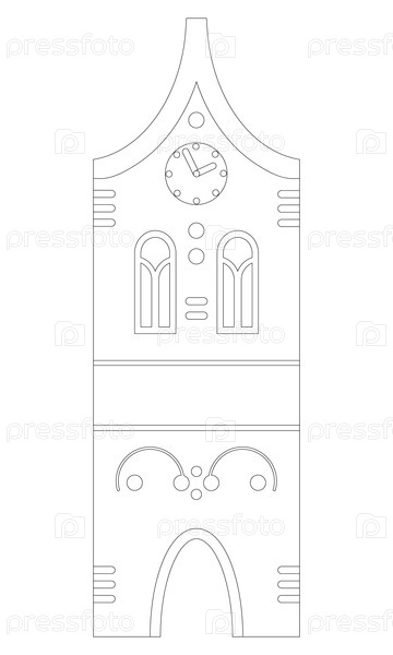 Векторная окрасочная страница Средневековый дом с часовой башней изолирован на белом фоне, вырезка готова