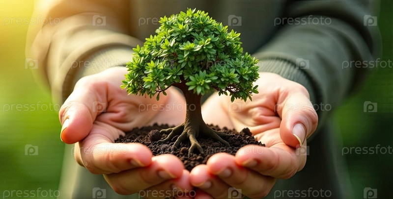 Крошечное зеленое дерево в горстке земли в руке в земле на близком расстоянии.Экология, уход, бонсай.Искусственный интеллект создан