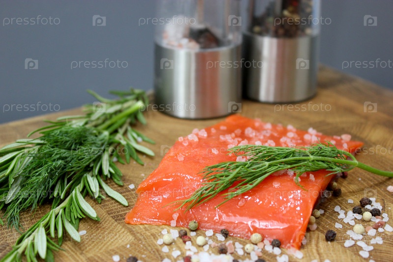 Кусок красной рыбы на деревянной доске с солью, перцем и зеленью, подготовка к посолу