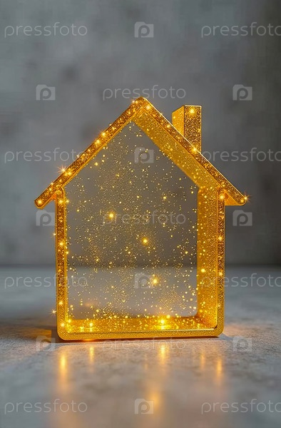 Прозрачное золото светящийся символ дома на сером бетонном фоне с золотым блеском. недвижимость, риэлтор, ипотека, страхование, бронирование, строительство, изоляция, отопление. ИИ генерируется