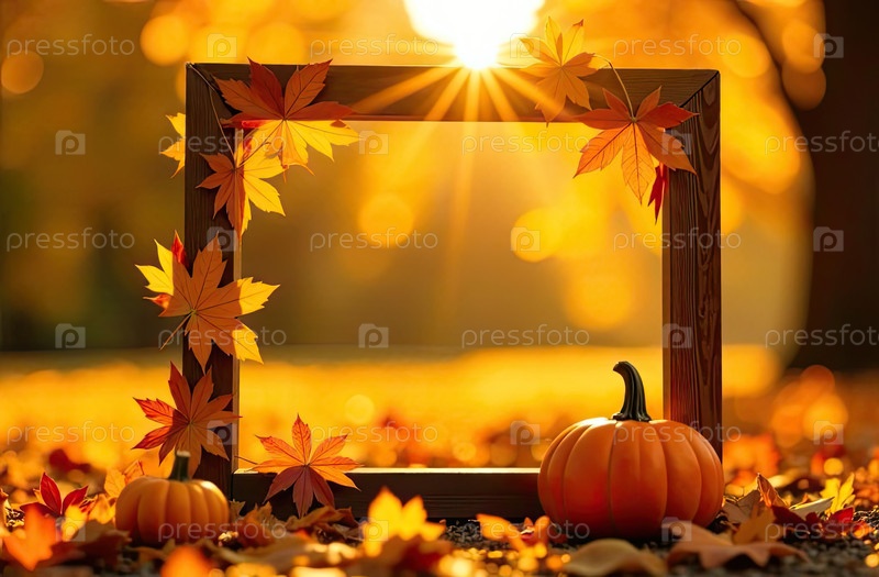 Рама украшена желтыми кленовыми листьями на осеннем фоне с тыквой в лучах солнца. баннер урожая и Хэллоуин, флаер с копировальным пространством. ИИ генерируется