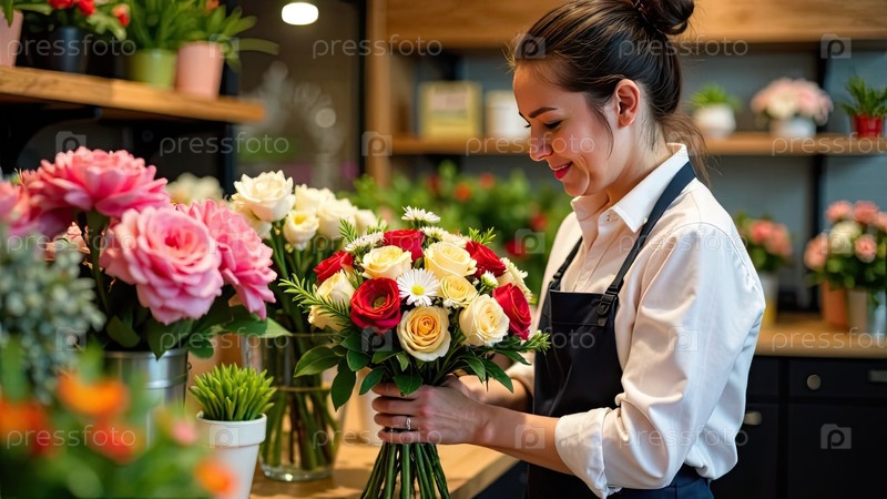 Букет роз и весенних цветов в руках флориста в интерьере цветочного магазина, доставка на праздник.Весна, 8 марта, женский день, день рождения.Искусственный интеллект генерирует