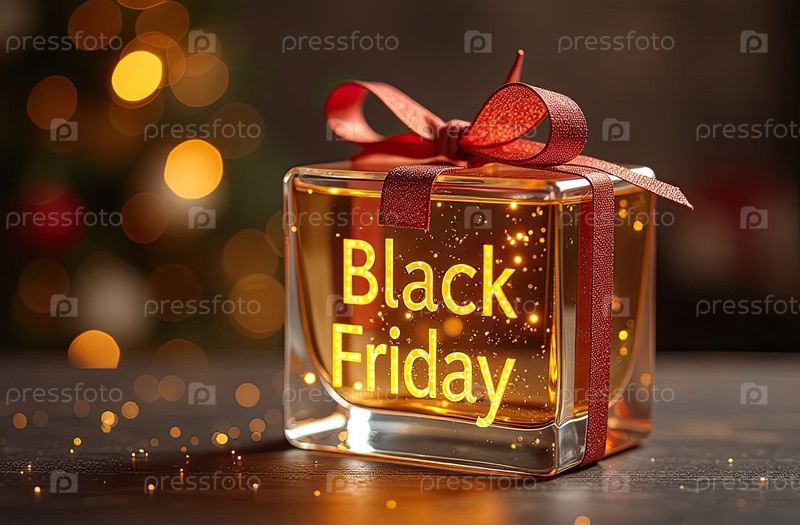 Неоновые светящиеся золотые буквы "Черная пятница" на прозрачной подарочной коробке с праздничным фоном золотистого бока. витрина магазина для Черной пятницы, распродажи, скидки, листовки, созданные ИИ