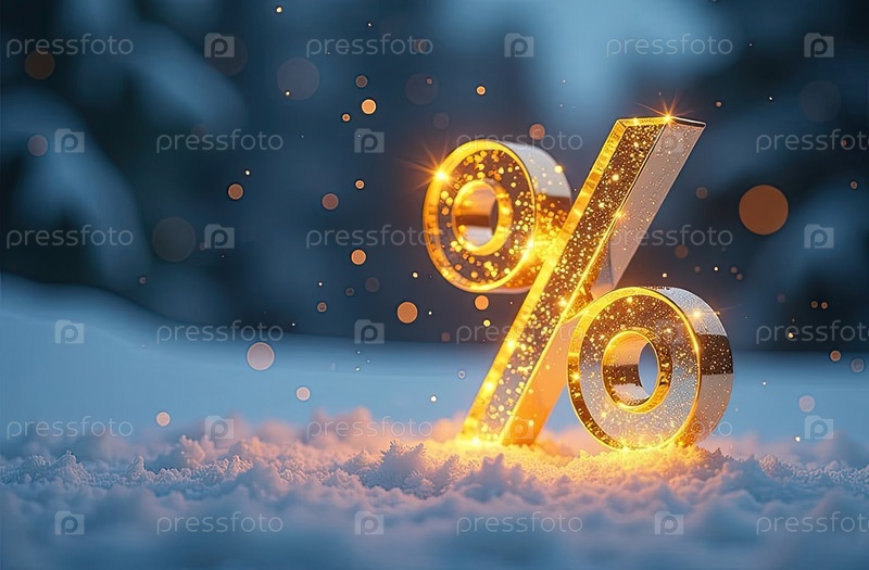 Неон светящийся золотой процентный знак на снежном фоне снаружи, блеск и снежинки. Зимняя распродажа и скидки, Черная пятница, Новый год, Рождество. баннер, флаер с копировальным пространством. ИИ генерируется