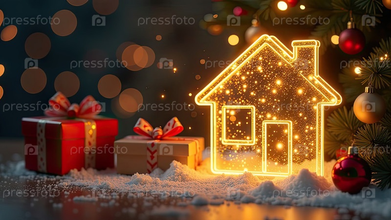 Прозрачное золото светящийся символ дома и коробка для подарков под елкой на рождественском фоне с золотым блеском