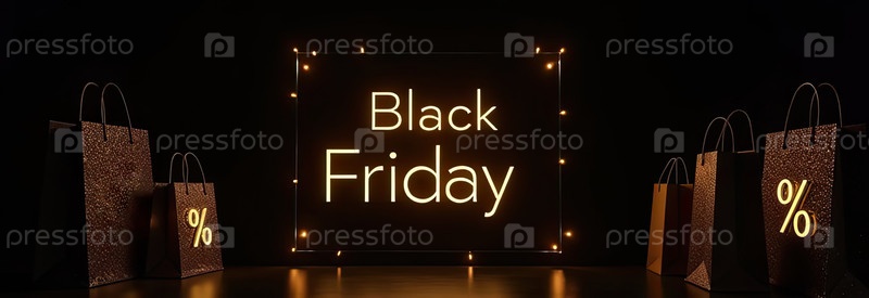Неоновые светящиеся золотые буквы "Черная пятница" на черном фоне. витрина магазина для Черной пятницы, распродажи, скидки, сумки для покупок, созданные ИИ